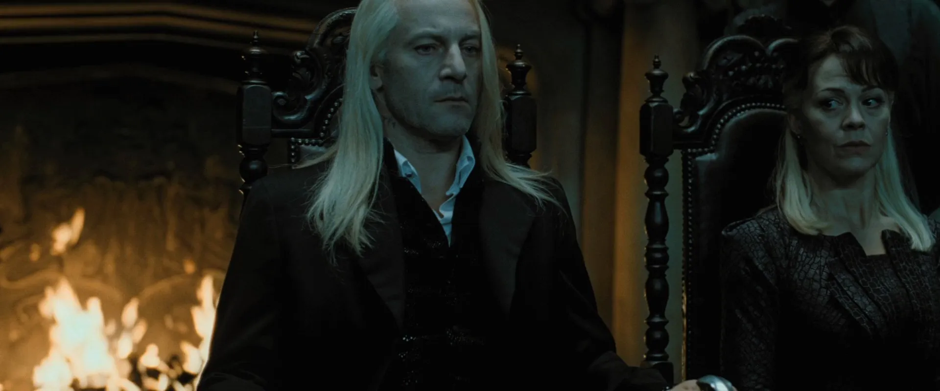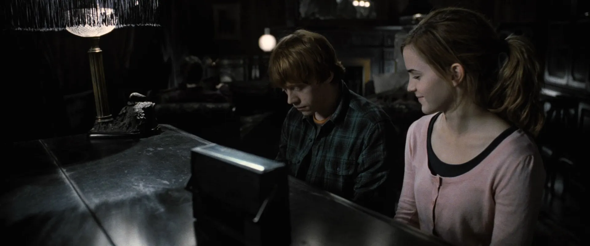 Cast: Daniel Radcliffe as Harry Potter, Rupert Grint as Ron Weasley, Emma Watson as Hermione Granger, Helena Bonham Carter as Bellatrix Lestrange, Robbie Coltrane as Rubeus Hagrid, Ralph Fiennes as Lord Voldemort, Michael Gambon as Albus Dumbledore, Bill Nighy as Rufus Scrimgeour, Brendan Gleeson as Alastor "Mad-Eye" Moody, Richard Griffiths as Vernon Dursley, John Hurt as Ollivander, Rhys Ifans as Xenophilius Lovegood, Jason Isaacs as Lucius Malfoy, Alan Rickman as Severus Snape, Fiona Shaw as Petunia Dursley, Timothy Spall as Peter Pettigrew, Imelda Staunton as Dolores Umbridge, David Thewlis as Remus Lupin, Warwick Davis as Griphook, Tom Felton as Draco Malfoy, Toby Jones as Dobby (voice), Dave Legeno as Fenrir Greyback, Simon McBurney as Kreacher (voice), Helen McCrory as Narcissa Malfoy, Nick Moran as Scabior, Peter Mullan as Corban Yaxley, David O'Hara as Albert Runcorn, Clémence Poésy as Fleur Delacour, Natalia Tena as Nymphadora Tonks, Julie Walters as Molly Weasley, Mark Williams as Arthur Weasley, Bonnie Wright as Ginny Weasley, Harry Melling as Dudley Dursley, Ian Kelly as Mr Granger, Michelle Fairley as Mrs Granger, Carolyn Pickles as Charity Burbage, Graham Duff as Death Eater, Guy Henry as Pius Thicknesse, Arben Bajraktaraj as Antonin Dolohov, Rod Hunt as Thorfinn Rowle, Suzie Toase as Alecto Carrow, Ralph Ineson as Amycus Carrow, Adrian Annis as Death Eater, Emil Hostina as Death Eater, Paul Khanna as Death Eater, Richard Strange as Death Eater, Anthony John Crocker as Death Eater, Peter G. Reed as Death Eater, Granville Saxton as Death Eater, Judith Sharp as Death Eater, Ashley McGuire as Death Eater, Penelope McGhie as Death Eater, Bob Yves Van Hellenberg Hubar as Death Eater, Tony Kirwood as Death Eater, David Ryall as Elphias Doge, James Phelps as Fred Weasley, Oliver Phelps as George Weasley, George Harris as Kingsley Shacklebolt, Andy Linden as Mundungus Fletcher, Domhnall Gleeson as Bill Weasley, Frances de la Tour as Olympe Maxime, Evanna Lynch as Luna Lovegood, Matyelok Gibbs as Auntie Muriel, Eva Alexander as Waitress, Matthew Lewis as Neville Longbottom, Jon Campling as Death Eater, Devon Murray as Seamus Finnigan, William Melling as Nigel Wolpert, Simon Grover as Death Eater, Freddie Stroma as Cormac McLaggen, Isabella Laughland as Leanne, Jessie Cave as Lavender Brown, Anna Shaffer as Romilda Vane, Josh Herdman as Gregory Goyle, Amber Evans as Twin Girl 1, Ruby Evans as Twin Girl 2, Katie Leung as Cho Chang, Georgina Leonidas as Katie Bell, Louis Cordice as Blaise Zabini, Scarlett Hefner as Pansy Parkinson, Afshan Azad as Padma Patil, Steffan Rhodri as Reginald Cattermole, Sophie Thompson as Mafalda Hopkirk, Daniel Tuite as Skinny Ministry Wizard, Daisy Haggard as Ministry Lift (voice), George Potts as Balding Wizard, Rose Keegan as Red Haired Witch, Ned Dennehy as Scared Man, Kate Fleetwood as Mary Cattermole, Daniel Hill as Bushy Haired Muttering Wizard, Rade Šerbedžija as Mykew Gregorovitch, Jamie Campbell Bower as Young Grindelwald, Hazel Douglas as Bathilda Bagshot, Adrian Rawlins as James Potter, Geraldine Somerville as Lily Potter, Miranda Richardson as Rita Skeeter, Michael Byrne as Gellert Grindelwald, Samuel Roukin as Snatcher, Toby Regbo as Young Albus Dumbledore (uncredited), Lewis Young as Snatcher (uncredited)